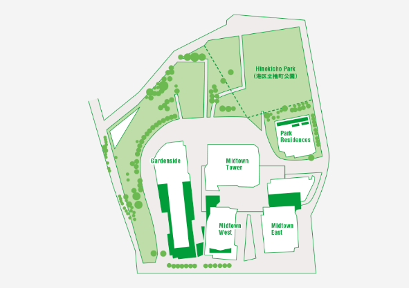 東京中城的風景,採用了日本自古以來的智慧——「日本庭園」的概念設計。與毗鄰的港區立檜町公園合計約有4公頃的廣闊綠地和開放空間,成為遊客和當地居民聚集、休憩的空間。綠地內移栽了原防衛廳院內留下來的大約140棵樟樹和櫻樹等樹木。另外又重新栽種了2萬棵灌木,綠化面積達到了原防衛廳時代約2.7倍。透過開業後的持續性管理,現有樹木中已有推定樹齡超過100年的樹木,為城市帶來了寧靜與生命力。