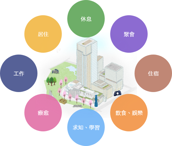 工作。居住。遊玩。休息。東京中城是集這方方面面於一體的複合都市。辦公大樓、住宅、飯店、美術館等設施,各自本身具有很高的功能自不必說,還透過這種種多彩的功能的相乘效應,創造出新的價值。